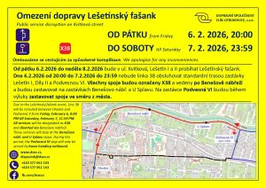 Výluka začne v pátek ve 20 hodin a potrvá do sobotní půlnoci. „V tomto termínu bude linka 38 vynechávat zastávky Podvesná VI a to ve směru do centra, a v obou směrech zastávky Díly II a Lešetín I,“ upozornil Martin Slačálek, technik jízdních řádů DSZO. Náhradní trasa povede do centra ze zastávky Podvesná XII přes zastávky U Splavu a Benešovo nábřeží na zastávku Vodní, odkud bude pokračovat po své standardní trase. Ve směru z města k Baťově nemocnici a na Příluky, Za Kapličkou pojede ze zastávky Dlouhá přes zastávky Benešovo nábřeží, U Splavu a Podvesná VI přímo na zastávku Podvesná X, kde se napojí na svůj standardní jízdní řád a trasu.
