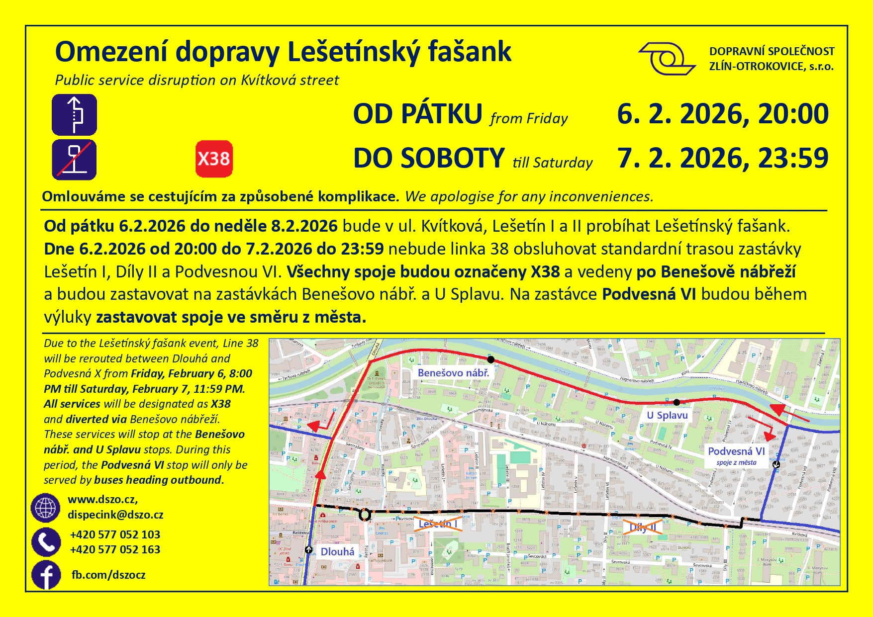 V pátek 6. února a v sobotu 7. února proběhne výluka na lince 38 Dopravní společnosti Zlín – Otrokovice (DSZO). Důvodem je konání Lešetínského fašanku ve Zlíně, což je tradiční masopustní veselice pořádaná nedaleko centra krajského města.