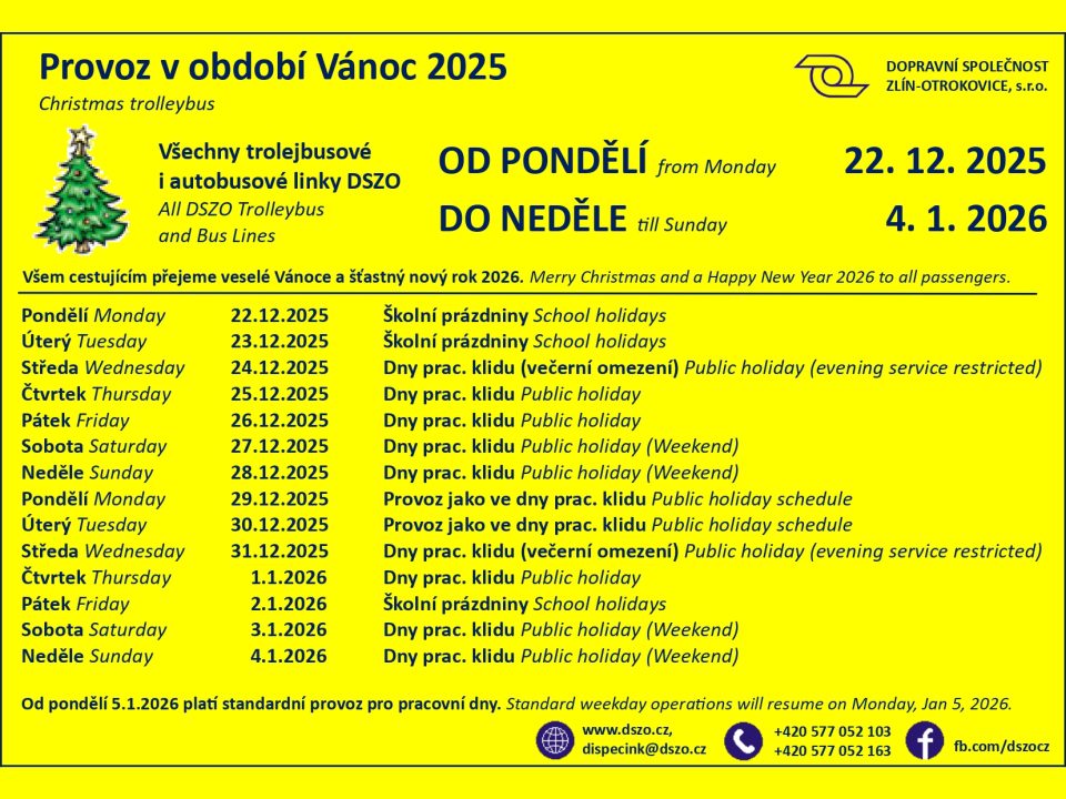 | pátek 26.12. | 6.45 – 17.30 hod. přestávka 12.20 – 12.50, 16.15 – 16.30 hod. |