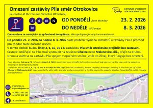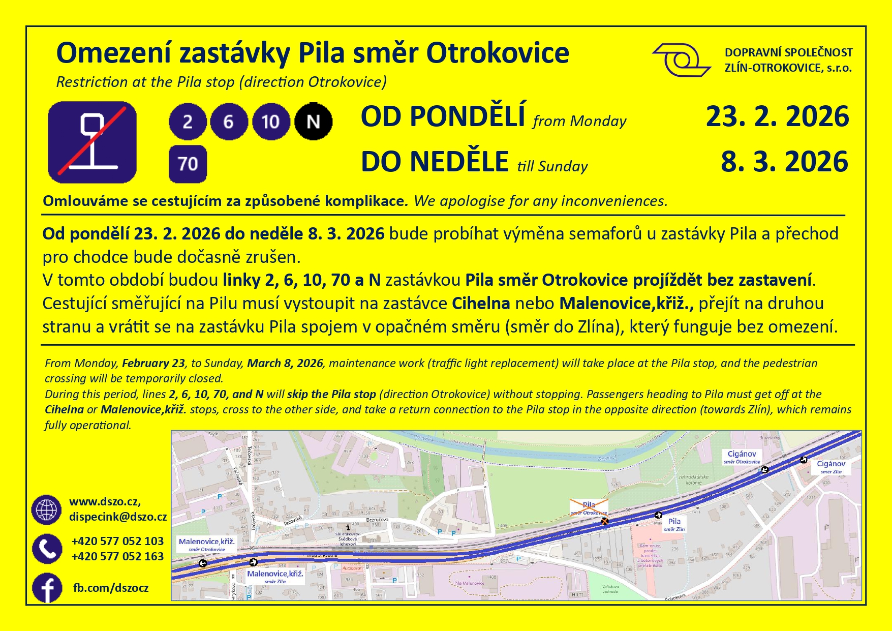 Od pondělí 23. února do neděle 8. března bude probíhat výměna semaforů u zastávky Pila ve Zlíně a přechod pro chodce bude dočasně zrušen. V tomto období budou linky Dopravní společnosti Zlín – Otrokovice (DSZO) 2, 6, 10, 70 a N zastávkou Pila směr Otrokovice projíždět bez zastavení.