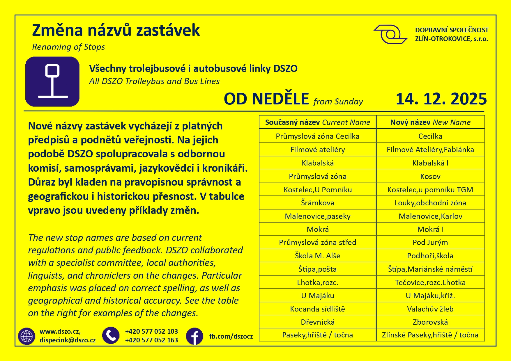 Zpřesnění původních názvů, důraz na pravopisnou správnost a geografickou i historickou souvislost. Od neděle 14. prosince mění Dopravní společnost Zlín – Otrokovice (DSZO) názvy některých zastávek MHD. Další změnou ke stejnému datumu je rozšíření spojů IDS na lince 32 na zlínskou místní část Kudlov.