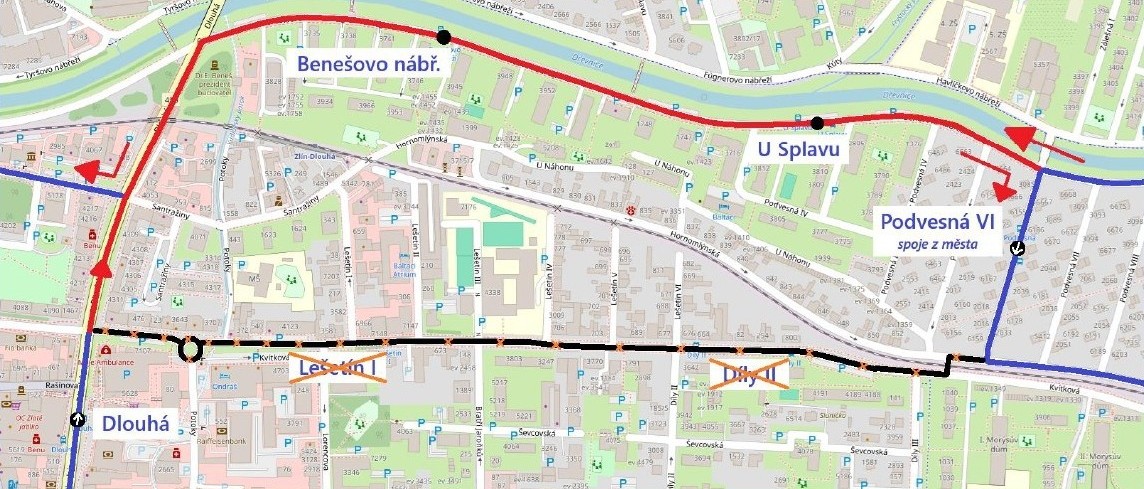 Výluka začne v pátek ve 20 hodin a potrvá do sobotní půlnoci. „V tomto termínu bude linka 38 vynechávat zastávky Podvesná VI a to ve směru do centra, a v obou směrech zastávky Díly II a Lešetín I,“ upozornil Martin Slačálek, technik jízdních řádů DSZO. Náhradní trasa povede do centra ze zastávky Podvesná XII přes zastávky U Splavu a Benešovo nábřeží na zastávku Vodní, odkud bude pokračovat po své standardní trase. Ve směru z města k Baťově nemocnici a na Příluky, Za Kapličkou pojede ze zastávky Dlouhá přes zastávky Benešovo nábřeží, U Splavu a Podvesná VI přímo na zastávku Podvesná X, kde se napojí na svůj standardní jízdní řád a trasu.